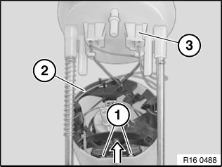 Carefully unlock tabs (1) and pull off fuel level sensor upwards in direction of arrow.