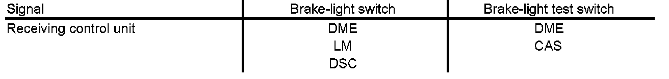 This ensures that the "Brake applied" signal is transmitted even in the event of a fault in the signal path. In contrast to the other control units, the two signals of the brake-light switch are simultaneously evaluated in the DME. This direct comparison of the two signals makes it possible to establish definitely whether the brake pedal is being operated. Furthermore, a malfunction of the brake-light switch can also be diagnosed. In addition, the function is still possible if one of the signals fails.