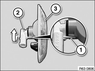Turn bulb holder (2) in direction of arrow and remove from auxiliary direction indicator (3).