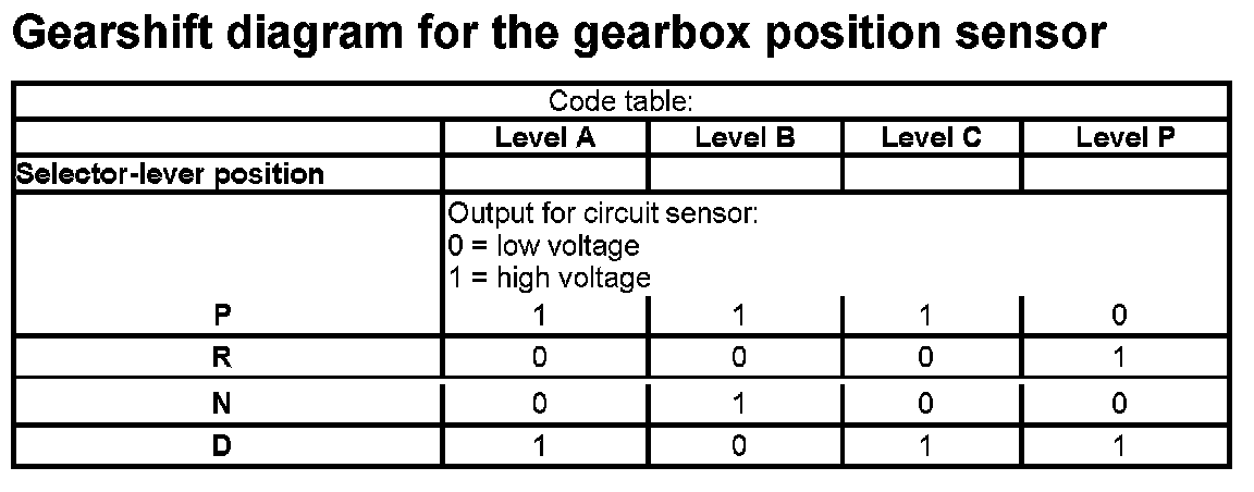The 5 inputs of the gearbox position sensor show each selector-lever position. The selector-lever position is transferred to the gearbox position sensor across a Bowden cable and is converted by the gearbox position sensor into a code. This code is transferred to the gearbox control and engine management system.