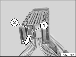 Unlock tab (1), pull contact carrier (2) in direction of arrow out of housing.