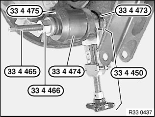 Pull rubber mount with special tool 33 4 465, 33 4 466, 33 4 475, 33 4 474 and 33 4 473 partially into the wheel carrier.