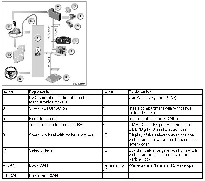 The electromagnet is supplied with current by the EGS control unit to release the selector lever as of terminal 15. A micro-switch picks up the interlocking or release of the selector lever. The micro-switch sends the signal to the CAS (Car Access System) to release the remote control.