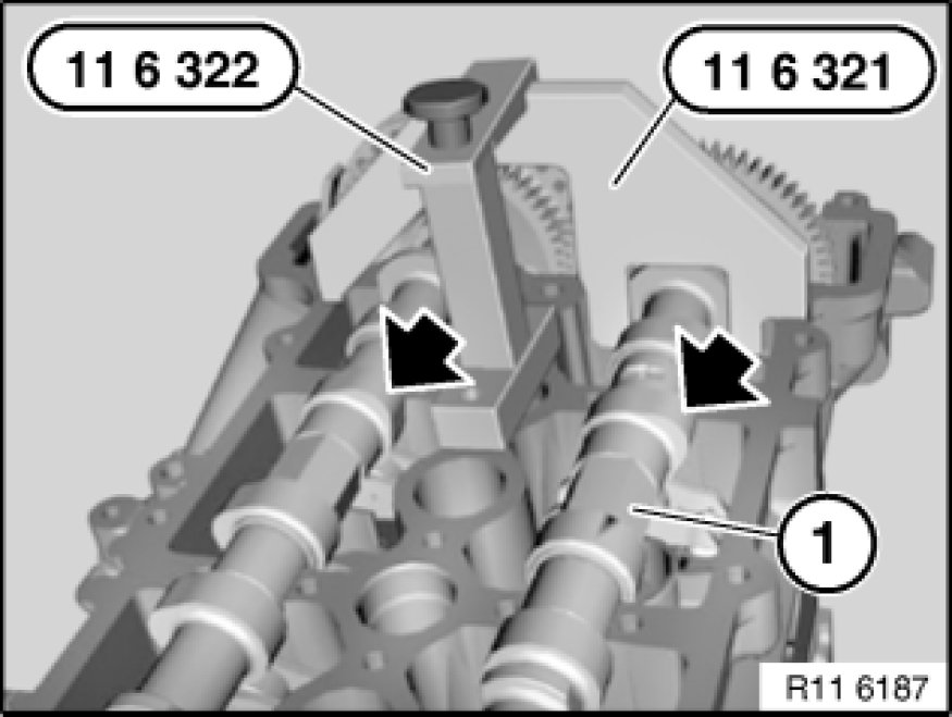 Place special tool 11 6 321 11 6 320 Locking Plug on exhaust camshaft.
