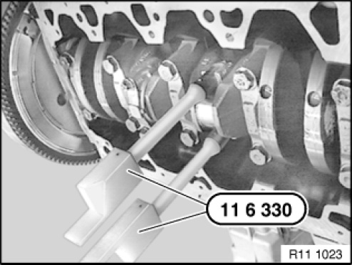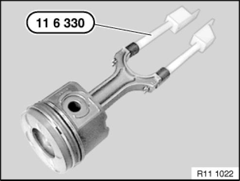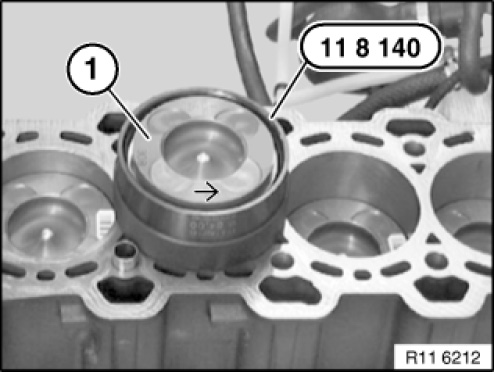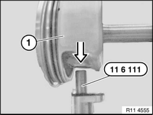 Guide lug and aperture on special tool 116 112 must point to piston crown; only then can special tool 11 6 113 be fitted correctly.