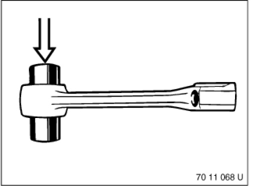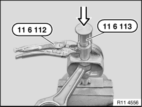 If special tools 11 6 112 and 11 6 113 are correctly positioned, the piston the circlip for gudgeon pin must be driven in with a plastic hammer in the direction of the arrow.