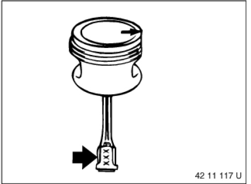 Fit connecting rod to piston in such a way that both of the visible matching numbers on the arrow indicating direction of installation on the piston point to the right.