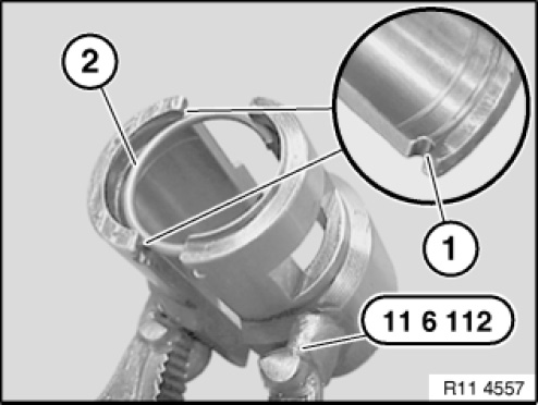 Insert piston circlip (2) into groove (1) of special tool 116 112.