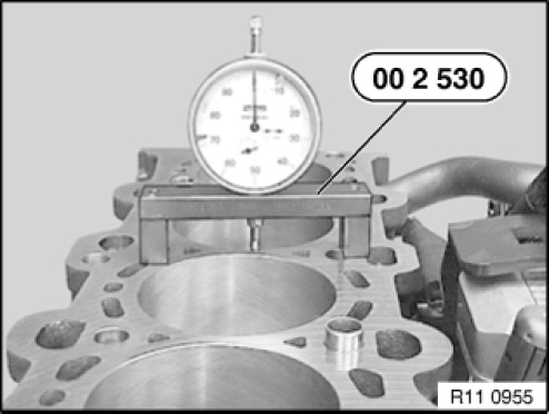 Fit dial gauge with measuring fixture special tool 00 2 530 on cleaned engine block sealing surface and set to zero under preload.