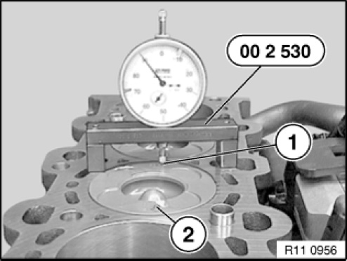 The highest piston protrusion at the measuring points (1 and 2) of all the pistons determines the thickness of the cylinder head gasket.