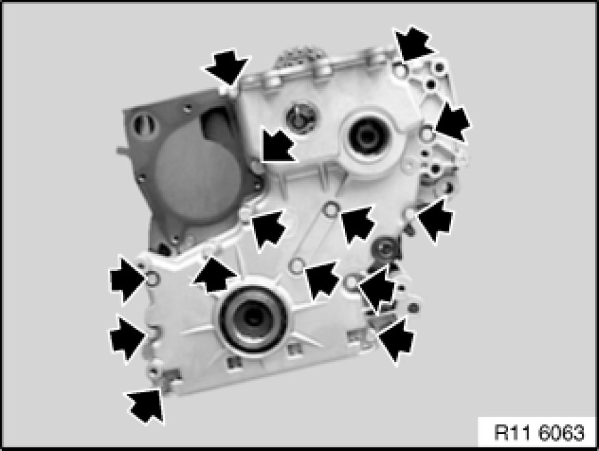 Apply a thin coat of Drei Bond 1209 sealing compound (sourcing reference: BMW Parts Service) to ends (arrows) of timing case cover on both sides.