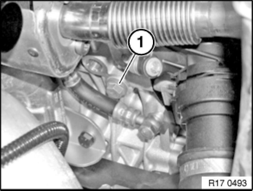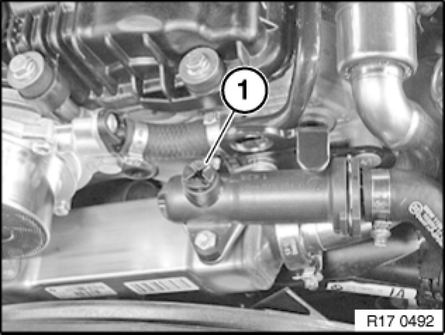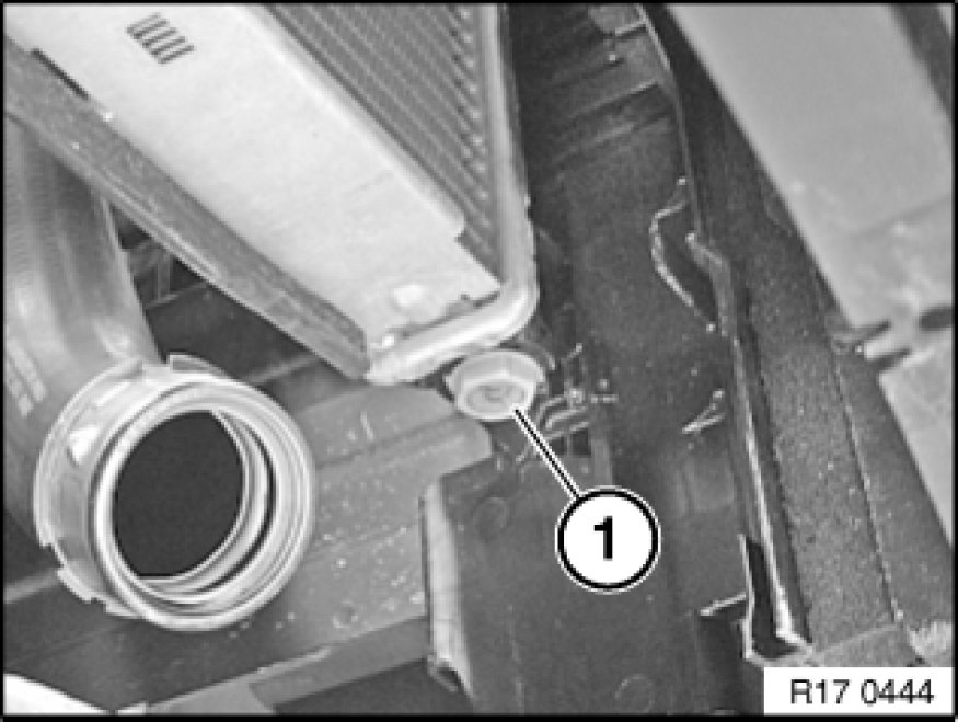 If fitted, slacken drain plug (1) on coolant radiator. On coolant radiators which do not have a drain plug, remove coolant hose.