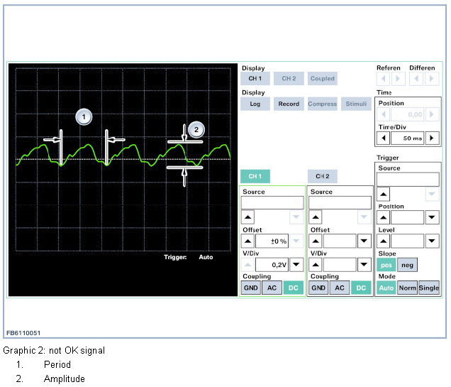 The figure below shows a rail pressure sensor signal that is in order thus indicating an intact high pressure pump. The signal pulsating uniformly at a period of approx. 25 ms and an amplitude of approx. 20 mV can be clearly seen. The maximum permissible value for the amplitude is 40 mV.