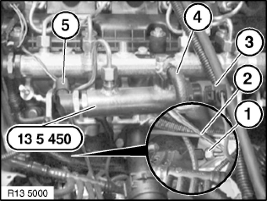 Disconnect plug connection for pressure control valve (3) and rail pressure sensor (5). Connect special tools 13 5 456 and 13 5 457 between special tool 13 5 450 and engine wiring harness.
