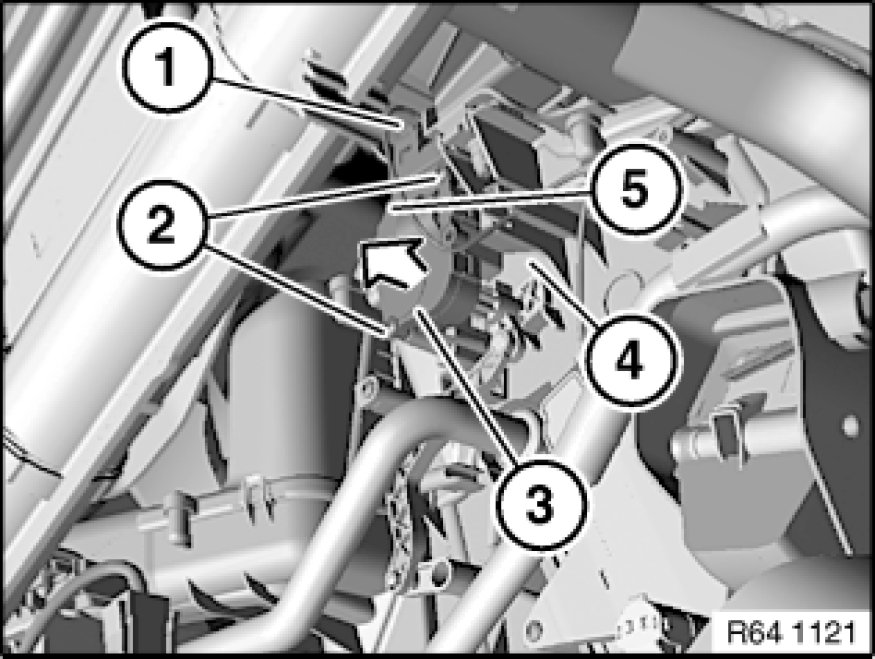 Detach servodrive for blending flap (3) in direction of arrow from heater/air conditioner (4).