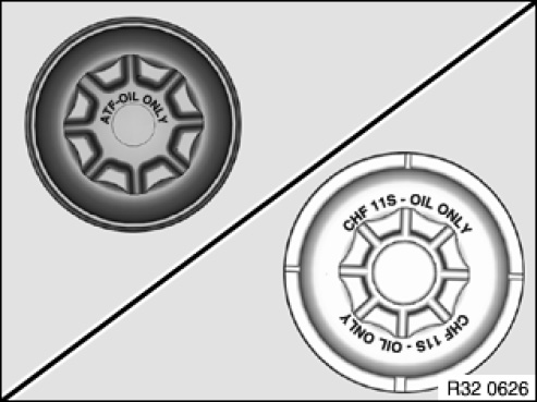 To avoid mix-ups when filling with hydraulic fluid, mark the fluid reservoirs or their caps with identification marks.