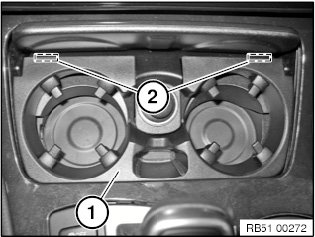 Using the index and middle fingers, pull cupholder insert (1) upward at marked position (arrows) until rear attachment points (2) unlock.