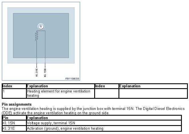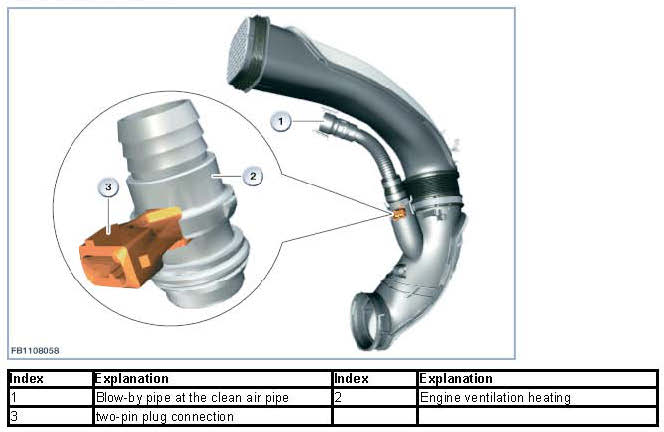 The engine ventilation heating is required for countries with very low temperatures in the winter to prevent the ventilation line from "freezing". The flow into the differentiated air intake system can freeze at constant-speed driving and temperatures below -25 °C as well as in extreme short-distance driving. A heating element according to the PTC principle is used.