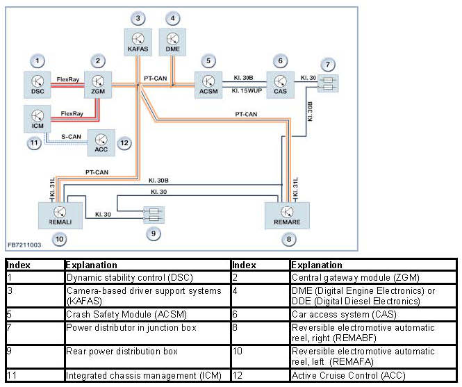 The Active Cruise Control (ACC) processes the signals about distance and speed about objects moving away from the vehicle in front of the vehicle and sends these to the Integrated Chassis Management (ICM). The request for tensioning the seat belt is sent via the PT-CAN to the respective reversible electromotive automatic reel (REMAFA and REMABF) via the Integrated Chassis Management (ICM).