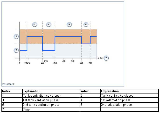 When the engine is started after it has been switched off for a certain period of time, the tank vent valve remains closed as long as the engine temperature is still below 40 °C. However, the fuel tank is still ventilated to the ambient air via the carbon canister. The fuel vapors that escape here are collected by the carbon canister. In the 1st adaptation phase, the fuel tank ventilation valve is closed. For the 3 load ranges (idle speed, lower load range and medium load range), a fuel mixture adaptation as deviation to Lambda value = 1 is made at certain engine speeds and load ranges.In the 2nd tank ventilation phase, the tank vent valve may be opened for the entire phase (270 seconds), provided no other requests are pending (for example, overrun fuel cutoff or diagnosis). In the 2nd adaptation phase, the fuel tank ventilation valve is closed again. For the 3 load ranges (idle speed, lower load range and medium load range), a fuel mixture adaptation as deviation to Lambda value = 1 is made at certain situations for load and engine speed. All other adaptations run in exactly the same way.