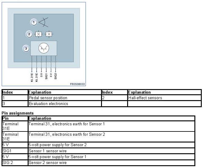Accelerator pedal position is monitored separately by 2 individual sensors. Two sensors are employed to provide redundancy, implement the monitoring function and facilitate recognition of malfunctions.