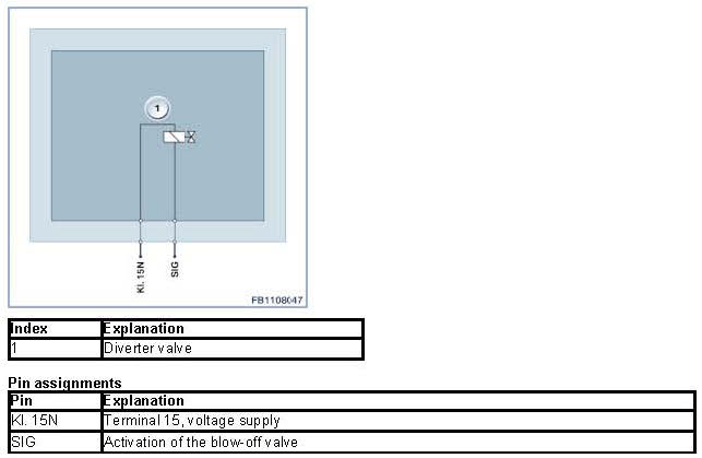 The blow-off valve is a solenoid valve. The blow-off valve is supplied with voltage via terminal 15N. Activation by the engine control occurs on the earth side.