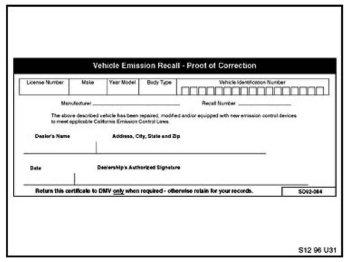 For California centers only: it is required by the California code of regulations that an executed orange "Vehicle Emission Recall - Proof of Correction" certificate (SD92-084, see illustration) be provided to each customer (for vehicles registered in the state of California), once the recall on his or her vehicle has been completed.