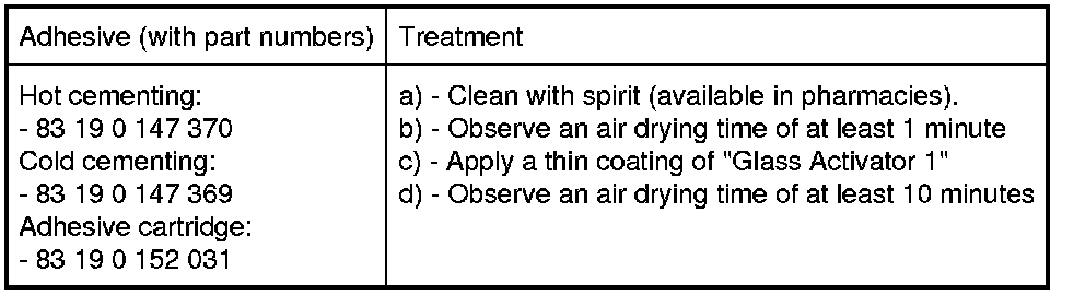 The windscreen and rear window (also the rear side windows if necessary) are bonded to the body. This gluing will increase the torsional strength of the vehicle. To obtain perfect bonding, comply with the installation procedure described in the following.