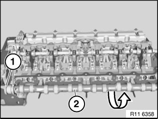 Insert intake camshaft (1) so that part number on mounting flats points upwards.
