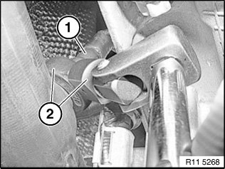 Release and tighten lambda monitoring sensor (1) on exhaust manifold of cylinder nos. 1 to 3 with special tool (2) 11 9 150.