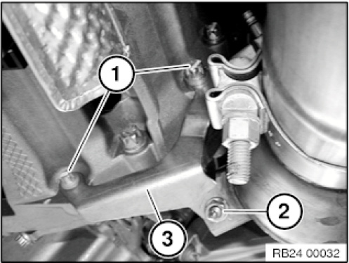 Note installed position of brackets (1 and 2) when removing gearbox.
