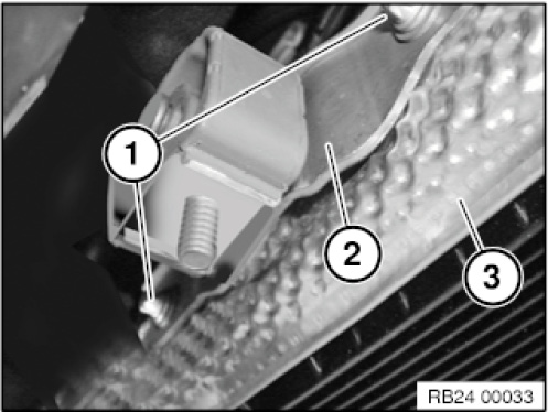 Crank engine at vibration damper in direction of rotation until screw (1) is visible in recess.