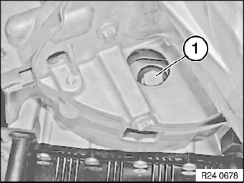 Insert special tool 24 4 160 into recess of transmission housing and clamp gently with screw (1).