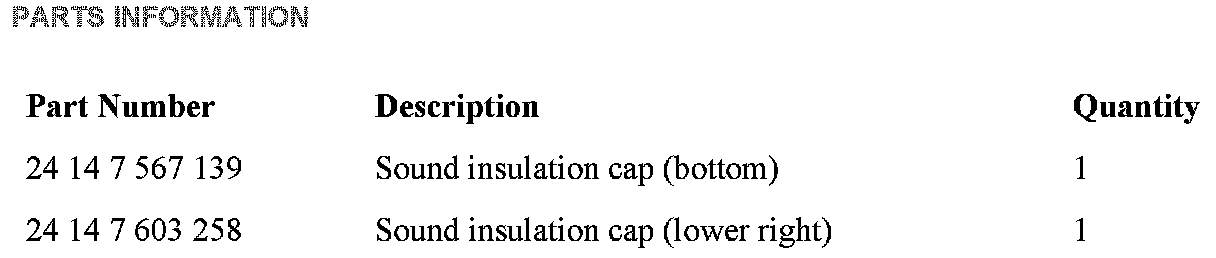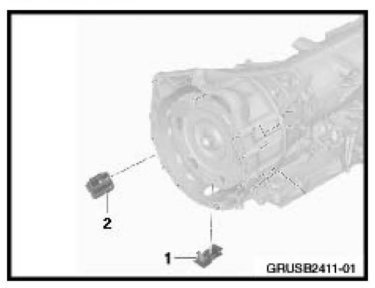 Install the sound insulation caps P/N 24 14 7 567 139 into the bottom hole (1) and P/N 24 14 7 603 258 into the lower right hole (2) of the transmission bell housing. Verify the noise has diminished.