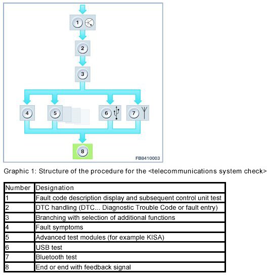 The procedure for the [telecommunications system check] starts with the display of the fault code descriptions. A control unit test is performed following this display. This control unit test is used to determine the current system status. The control unit test runs in the background.
