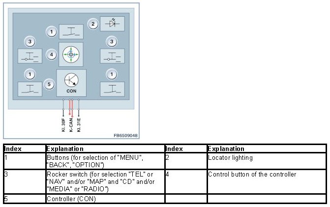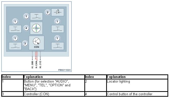 The controller reads in the button signals. The controller converts the signals to messages on the K-CAN and/or KCAN2 (depending on the series and model year). The messages are processed by the headunit. The central information display (CID) receives the signals for display on the LVDS data line (Low Voltage Differential Signalling) from the headunit.