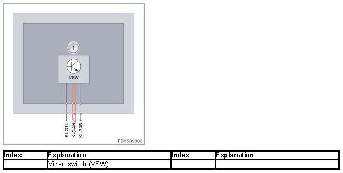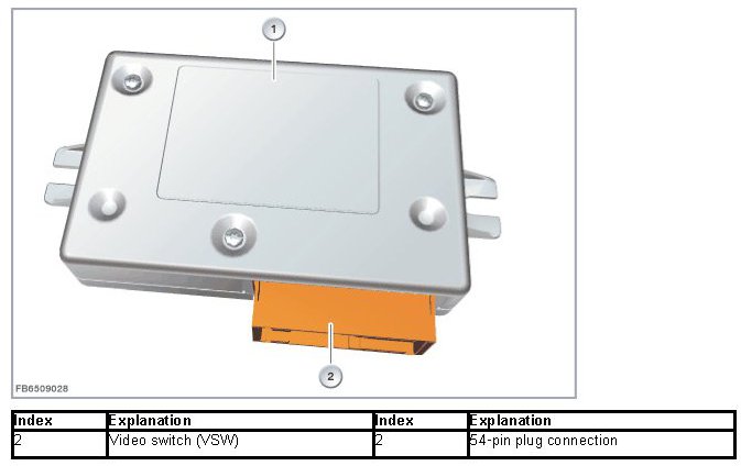The video switch (VSW) is connected to the K-CAN and vehicle electrical system by means of a 54-pin plug connection.