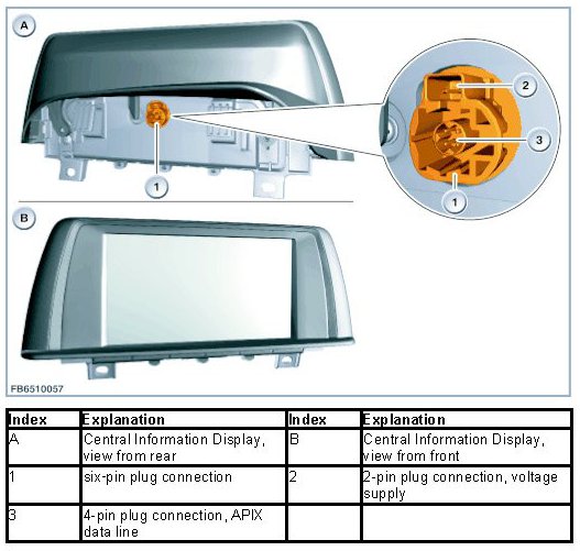 The central information display is connected directly to the headunit via an APIX data line. The central information display represents image data supplied by the headunit. With this technology the central information display no longer has a CAN connection. Thus the central information display is no longer a control unit in the diagnostic range.