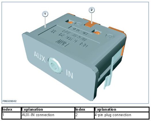 If an external audio source is connected to the AUX-IN connection via the jack plug, the audio data are transferred to the headunit via an audio line. The audio source is selected via iDrive. The music tracks are selected on the external audio source.