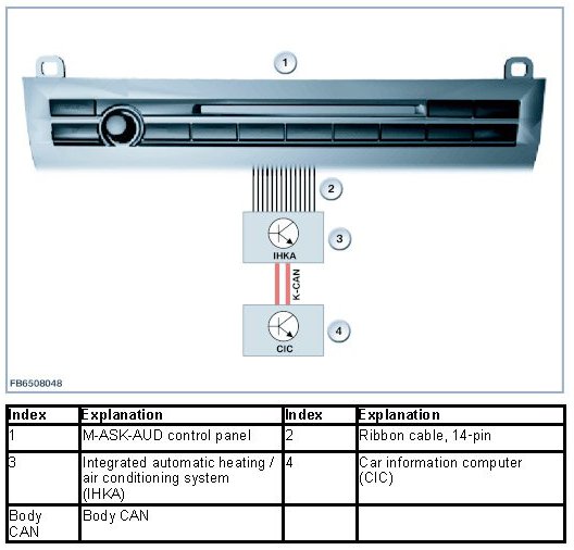 The operating unit for M-ASK-AUD with the 'favorites' buttons is not connected directly to the CIC. The operating facility is integrated in the control panel for the IHKA. The electrical connection is by means of a ribbon cable leading to the IHKA control unit. The IHKA sends the signals in messages on the K-CAN.