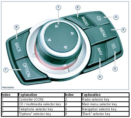 The selector keys are used now instead of pushing the controller for a longer period in a certain direction. A small switch block is electrically connected at the controller. Depending on the options fitted, the switch block contains the controls for the Park Distance Control (PDC = parking aid) as well as for the bumper camera. The signals are placed by the controller (CON) on the K-CAN.