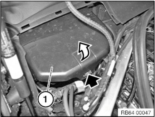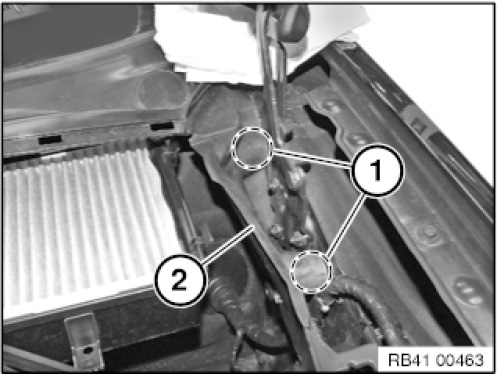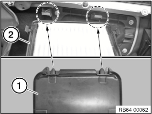 Ensure that latch mechanisms on the microfilter housing cover (1) are correctly seated under retaining lugs on microfilter housing (2).