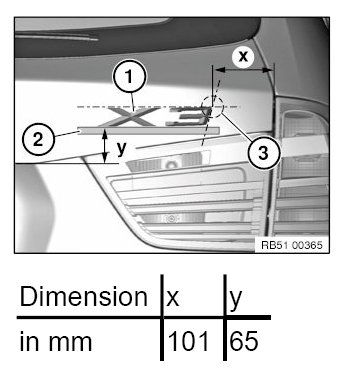 3 = Point of intersection (upper outer corner point of model name plate (1) with dimension "x" to side edge of rear lid)