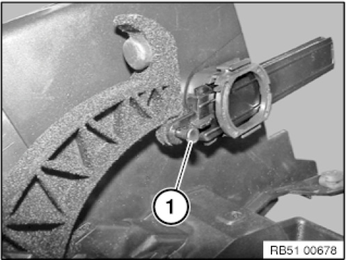 Remove hinge bolts (1) left and right from the glove box cover (2) in direction of arrow.