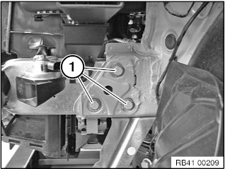 Press the 5 latch mechanisms inward and remove bearing pin (2) upward. Shown on left side, right side identical.