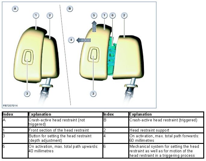 On activation, the crash-active head restraint reduces the distance between the head restraint and head in order to reduce the load on the cervical vertebrae during a rear-end collision. (Reason: The distance between the head and head restraint can increase as the result of the range of adjustment of the seat.)