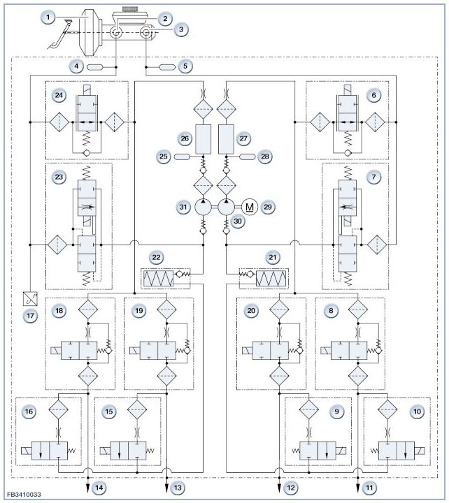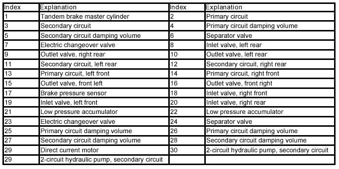 In every brake circuit, there are pairs of solenoid valves. One intake valve (de-energized open) and one discharge valve (de-energized closed). By activating these correspondingly, the brake pressure at the front wheels and rear wheels is modulated.