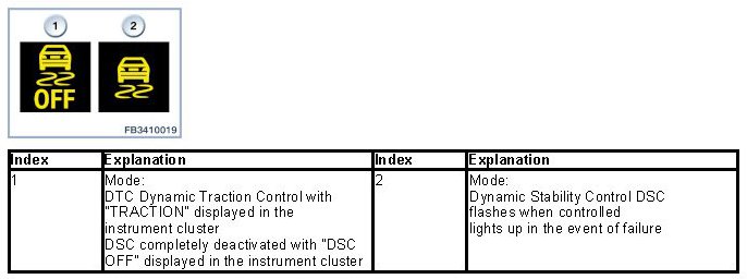 Depending on the DSC mode, the indicator light in the instrument panel is switched on. The indicator light shows a skidding vehicle with the labelling "OFF" or only a skidding vehicle.