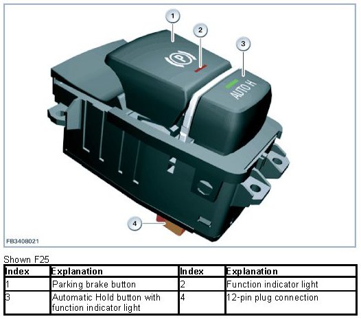 The "Automatic Hold" button is integrated within the parking brake button. The "Automatic Hold" button is electrically connected to the DSC control unit.