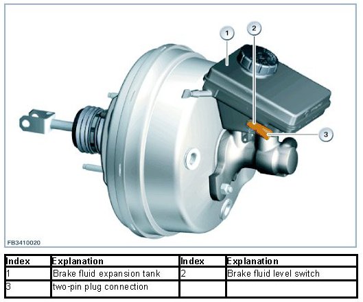 The brake fluid level switch detects that the brake fluid level has dropped below the required (minimum) brake fluid level in the brake fluid expansion tank. The DSC control unit sends the signal of the bus system to the instrument panel. The instrument panel issues a Check Control message. Normal movements of the brake fluid (during braking or acceleration) in the brake fluid expansion tank will not normally lead to a Check Control message. A reed contact is installed on the side of the brake-fluid reservoir. The reed contact transmits an electrical signal if the brake fluid level falls below a specified minimum level. The reed contact is closed while the brake fluid level is above the minimum mark.